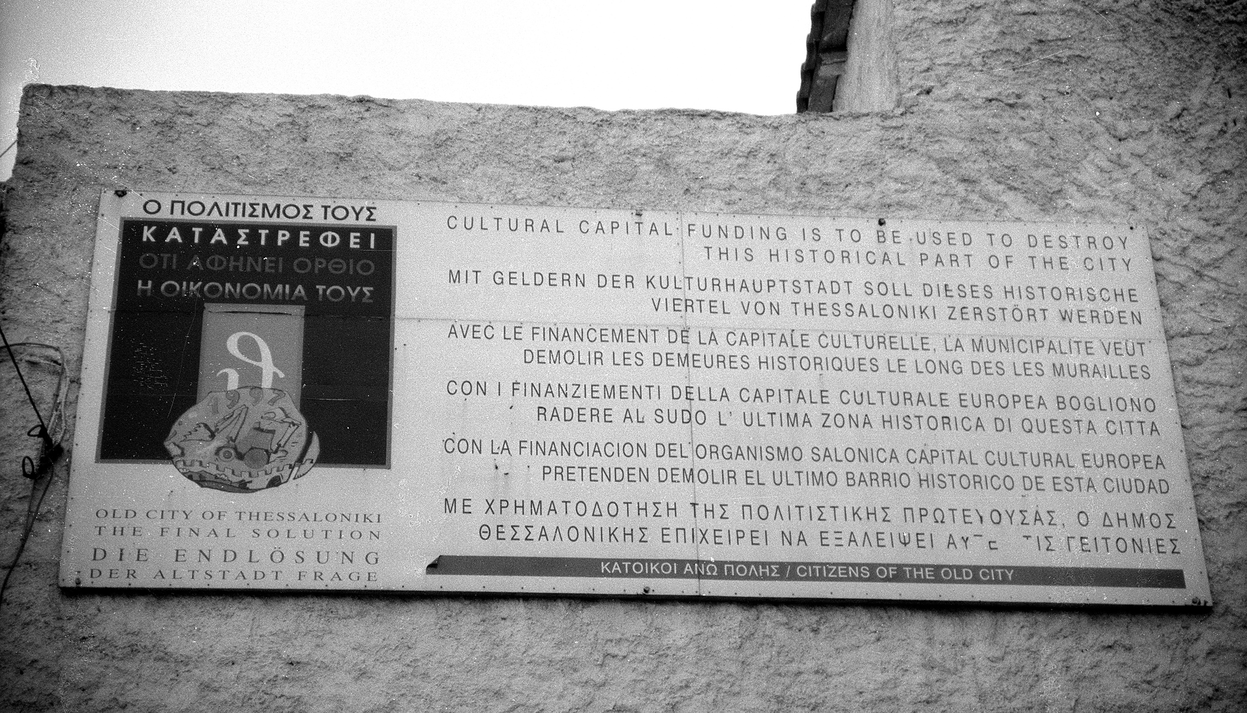 On closer inspection, however, it becomes clear that the designers of the sign have replaced the sailboat in the original logo of the Thessaloniki European Capital of Culture organisation with a bulldozer crushing the ‘kastroplikta’. In six different languages, the sign’s main message says: ‘FUNDED BY THE INSTITUTION OF THE EUROPEAN CULTURAL CAPITAL, THE MUNICIPALITY OF THESSALONIKI ATTEMPTS TO ELLIMINATE THESE NEIGHBOURHOODS’. Over the altered logo, the sign reads: ‘WHAT THEIR ECONOMY DOESN’T RUIN, THEIR CULTURE DOES’ and on the bottom left of the sign, in English and German, it says: ‘OLD CITY OF THESSALONIKI, THE FINAL SOLUTION’.
