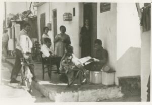 -Χ. Γίνεται γιατί ένα δωμάτιο μας δώκανε. Και ήταν όλα, τουαλέτες και πλυσταριά ομαδικά. Όταν τα γκρεμίσανε, ήταν εδώ πέρα ένα μέτρο πράγμα, έβαλε η μάνα μου εδώ μια τουαλέτα, μετά τη γκρέμισε, λίγο λίγο έκανε ένα ντουβαράκι, έκανε αυτό το…η καημένη τι να κάνει; Έκανε ένα..τουαλέτα, έκανε μία κουζίνα. Καλά που ήμασταν και πολλά παιδιά, απέναντι τέσσερα παιδιά, δίπλα τέσσερα παιδιά, σε ένα δωμάτιο. Τί τραβήξαμε αγοράκι μου… πείνα; φτώχεια; τι τραβήξαμε αγοράκι μου…