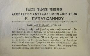 Κ. Papaioannou also advertised his experience as a former employee in the Exchangeable Assets Management Service in his press promotion, even though he did not undertake refugee affairs in general but rather specialised in the purchase of exchangeable land.