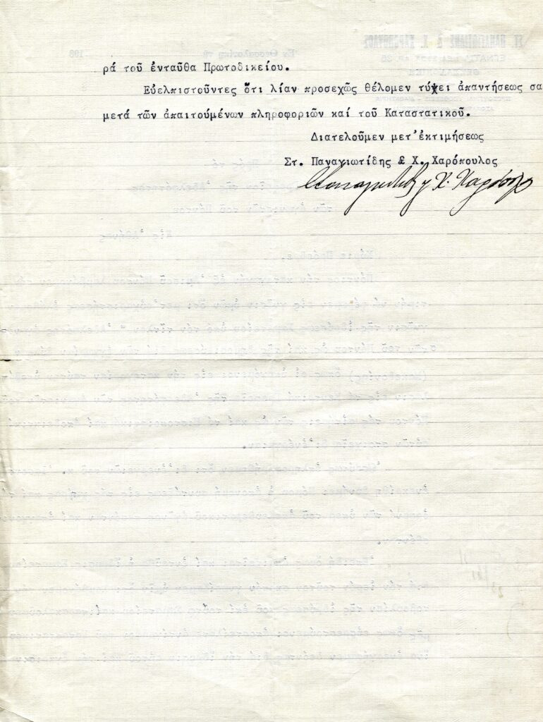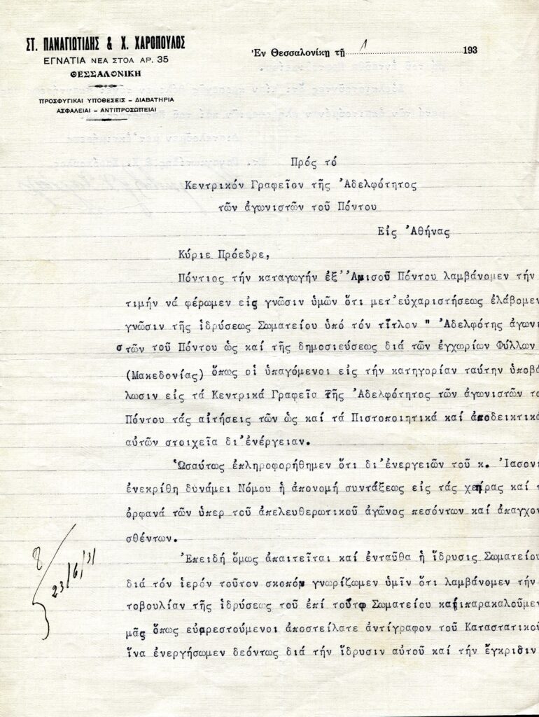 The firm of St. Panagiotidis and Ch. Charopoulos had an office at a central location in Thessaloniki which handled ‘refugee affairs’. In this letter, they inform the Brotherhood of Pontus Fighters, an association based in Athens, that they would be willing to establish an association in Thessaloniki which would tackle the issue of war pensions for the widows and orphans of the Pontus insurgency. The Brotherhood had recently pressured the relevant authorities to grant pensions and was collecting applications. With their letter, Panagiotidis and Charopoulos were asking the Brotherhood to send over the organisation’s charter.