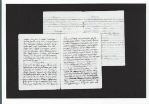 Η τρίτη φωτογραφία προέρχεται από το τετράδιο εκθέσεων ενός νεαρού εβραιόπουλου, του Μάρκου Ισχακή. Χρονολογείται στο 1942, όταν ο μικρός Μάρκος πήγαινε Γ΄ Δημοτικού. Η έκθεση που φαίνεται στη συγκεκριμένη φωτογραφία περιγράφει μια καθημερινή μέρα του παιδιού στην πόλη κατά τη διάρκεια της Κατοχής. Ο μικρός Μάρκος και η οικογένειά του έμεναν στο κέντρο της παλιάς πόλης, στην εβραϊκή συνοικία. Η περιγραφή της μέρας του μας μεταφέρει σε μια καθημερινότητα παιδική, μια καθημερινότητα που εστιάζει στον μικρόκοσμο και τη ρουτίνα της οικογένειας: διάβασμα, φαγητό, βόλτα, οι γονείς, το καφενείο, το σπίτι, το σχολείο. Η καθημερινότητα ενός μέσου παιδιού στα Χανιά εκείνα τα χρόνια.