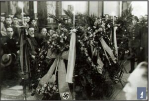 Η τελευταία φωτογραφία προέρχεται από την κηδεία του Γερμανού πρόξενου στα Χανιά, Ρίχαρντ Κρούγερ. Ο Κρούγερ ζούσε στα Χανιά για δεκαετίες. Παρέμεινε στην πόλη και μετά το τέλος της θητείας του, όταν πια σε μεγάλη ηλικία ορίστηκε ως επίτιμος. Είχε αρκετές σχέσεις με τους ντόπιους. Πέθανε μέσα στην Κατοχή, τον Μάρτιο του 1944. Η κηδεία του έγινε στον Ναό της Μητρόπολης των Χανίων, αν και ήταν ορθόδοξος ναός, πιθανότατα όμως όχι με το ορθόδοξο τυπικό. Στην κηδεία του παρευρέθηκαν όλες οι αρχές. Οι συμβολισμοί ήταν έντονοι, καθώς κηδευόταν ο πρώην πρόξενος της Γερμανίας, εν μέσω της γερμανικής κατοχής, σημαιοστολισμένος με την σβάστικα, ανάμεσα σε όλους τους τοπικούς εκπροσώπους. Στη φωτογραφία που περιλαμβάνεται στην παρούσα εγγραφή και προέρχεται από σχετική δημοσίευση του Μ. Μανούσακα, ανάμεσα στις τοπικές αρχές διακρίνει κανείς και τον τελευταίο ραβίνο της εβραϊκής κοινότητας Χανίων, τον Ηλία Όσμο. Φαίνεται καθισμένος αριστερά του φέρετρου, με γυαλιά και κιπά. Είναι μόλις δύο μήνες πριν τη μαζική σύλληψη του εβραϊκού πληθυσμού της πόλης.