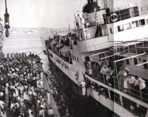 Το αίτημα επαναπατρισμού των προσφύγων τέθηκε σχετικά νωρίς από τους ίδιους και από το ΚΚΕ. Το ΚΚΕ όμως ζητούσε τον συνολικό επαναπατρισμό των προσφύγων κάτι που καμιά κυβέρνηση στην μεταπολεμική Ελλάδα δεν έκανε δεκτό. Οι πρώτοι επαναπατρισμοί έγιναν με τη μεσολάβηση του Διεθνούς Ερυθρού Σταυρού το 1954 και αφορούσαν άτομα από την Ουγγαρία, τη Ρουμανία και την Τσεχοσλοβακία. Η φωτογραφία που παρουσιάζεται εδώ προέρχεται μάλλον από την πρώτη αυτή επιστροφή στο λιμάνι της Θεσσαλονίκης. Κατά μια περίεργη σύμπτωση το πλοίο που μετέφερε τους πολιτικούς πρόσφυγες ήταν το ίδιο που είχε μεταφέρει τον Απρίλιο του 1948 στρατεύματα του Εθνικού Στρατού στη Στερεά Ελλάδα για την πρώτη μεγάλη εκκαθαριστική επιχείρηση εναντίον του ΔΣΕ.