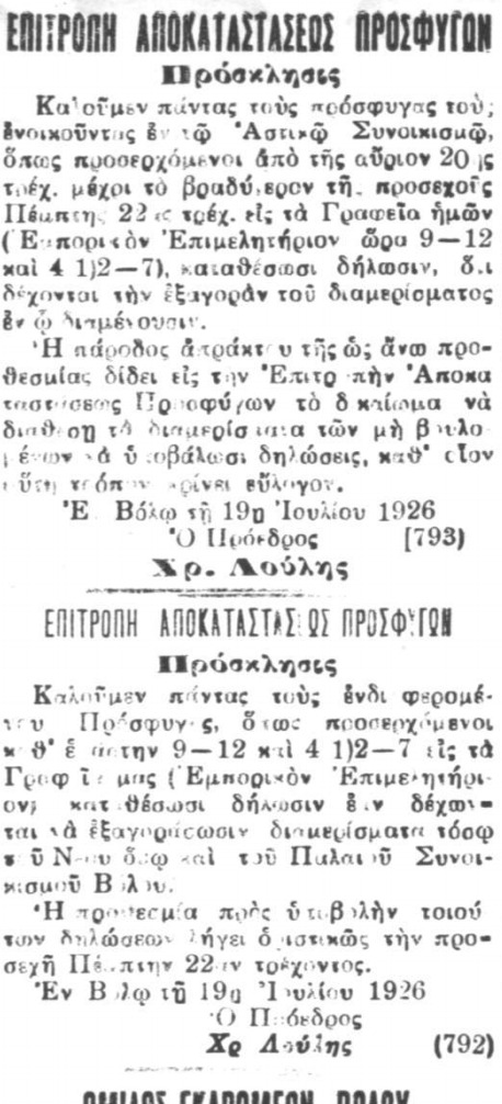 Εφημερίδα Η Θεσσαλία, 20.1.1926, 19.2.1926, 23.6.1926, 4.7.1926, 22.7.1926, 26.7.1926, 12.8.1926, 14.91926
