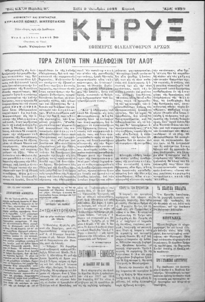 Εφημερίδα Κήρυξ 9.10.1922, σ. 1