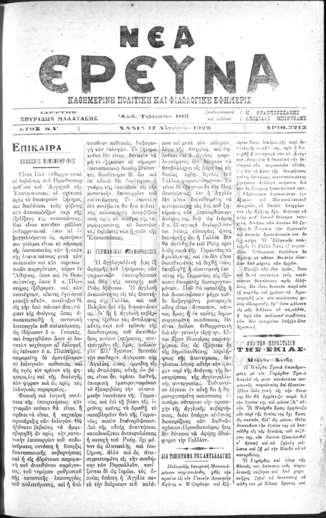 Εφημερίδα Νέα Έρευνα 17.8.1923, σ. 1