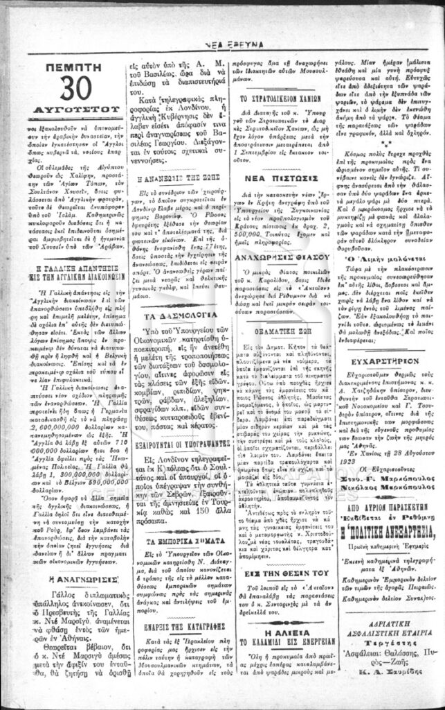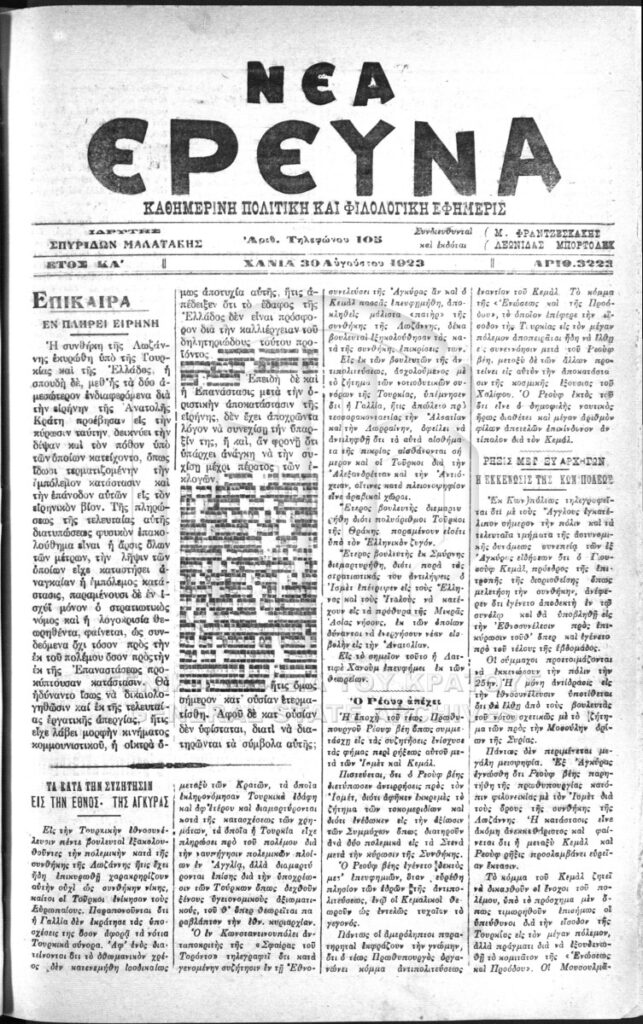 Εφημερίδα Νέα Έρευνα 30.8.1923, σ. 1-2