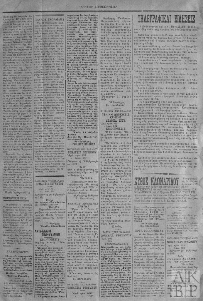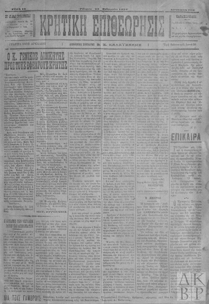 Εφημερίδα Κρητική Επιθεώρησις 23.2.1924, σ. 1,3
