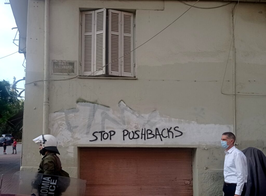 Σύνθημα σε τοίχο πολυκατοικίας στην πλατεία Μουσχουντή, επί της οδού Κασσάνδρου, στις αρχές της Άνω Πόλης. Το σύνθημα «Stop Pushbacks» καταγγέλλει τις αυξημένες παράνομες επαναπροωθήσεις μεταναστών προς την Τουρκία που καταγράφονται εντονότερα από το 2020. Ειδικότερα στην περίπτωση της Θεσσαλονίκης υπάρχουν πολλές καταγγελίες για βίαιες απαγωγές και επαναπροωθήσεις μεταναστών από την ανοιχτή δομή φιλοξενίας – πρώην στρατόπεδο Αναγνωστοπούλου στα Διαβατά, οι οποίες εντάθηκαν ιδιαίτερα την περίοδο της καραντίνας λόγο της πανδημίας του covid-19.