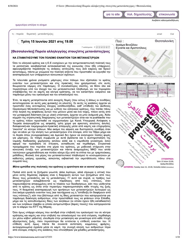 Το σύνθημα στο φωτογραφικό τεκμήριο γράφτηκε κατά την διάρκεια πορείας αλληλεγγύης σε μετανάστες που καλέστηκε στις 15 Ιουνίου 2021 από αντιεξουσιαστικές και αναρχικές συλλογικότητες της πόλης.